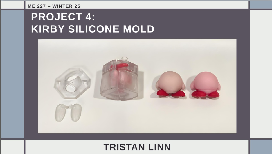 The Kirby Silicone Mold is an SLA additive manufacturing project, exploring the process of developing a multi-stage modular silicone mold to achieve multi-color casts. The project was conducted over the span of two week and used a FormLabs Form 4 SLA printer and EcoFlex 15 Silicone.